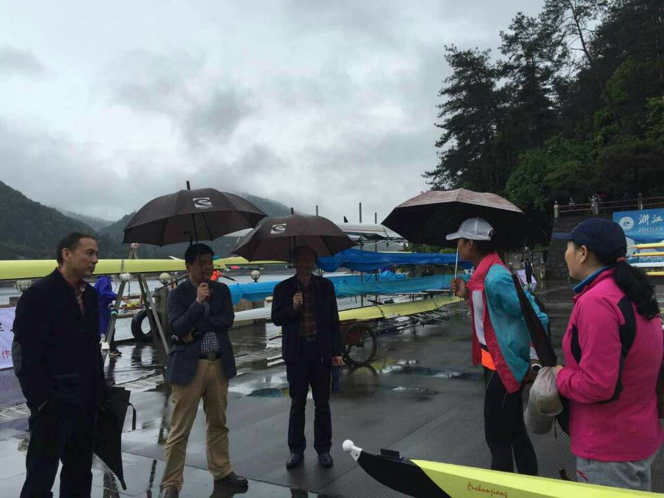 4月20日,千岛湖上风雨交加,学校纪委书记朱建中、副校长张飙,竞技体育学院院长徐菊生一行赶到千岛湖国家水上训练基地,指导和鼓励我校赛艇健儿参加冠军赛。