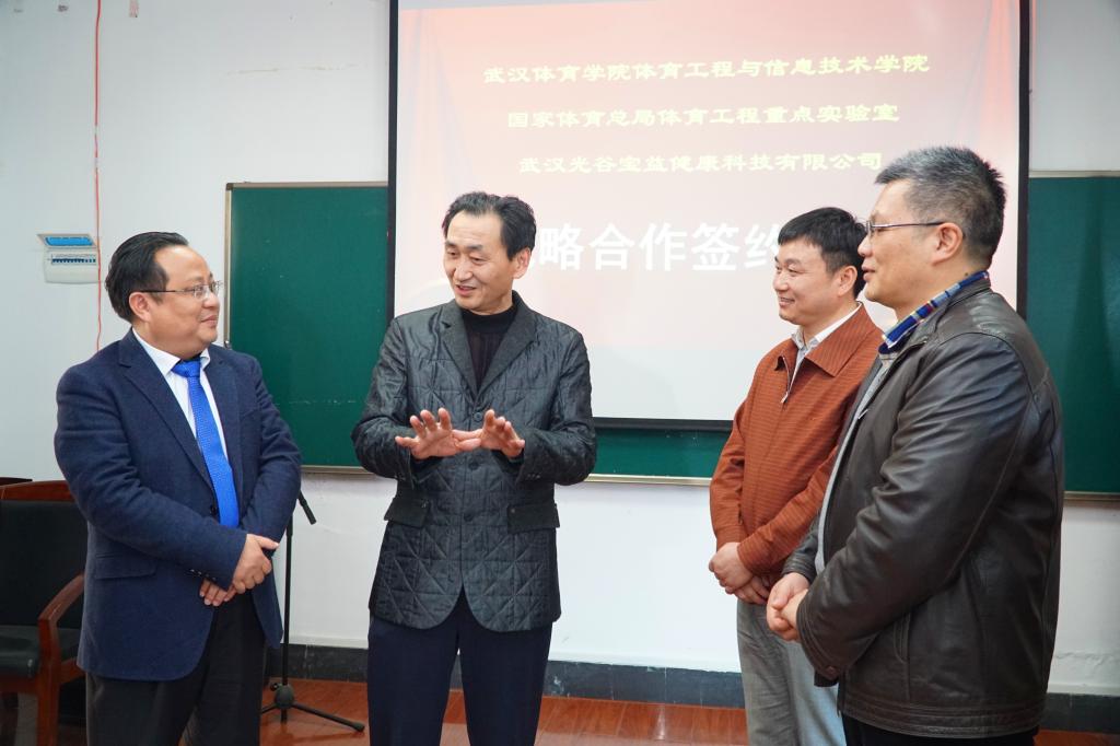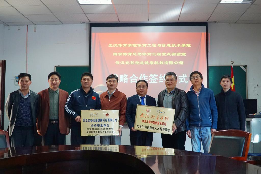 2016年3月31日, 由武汉体育学院体育工程与信息技术学院及国家体育总局体育工程重点实验室与武汉光谷宝益健康科技有限公司的“战略合作签约仪式”在武汉体院体育工程与信息技术学院会议室顺利举行。武汉体育学院党委书记彭道海莅临签约仪式。