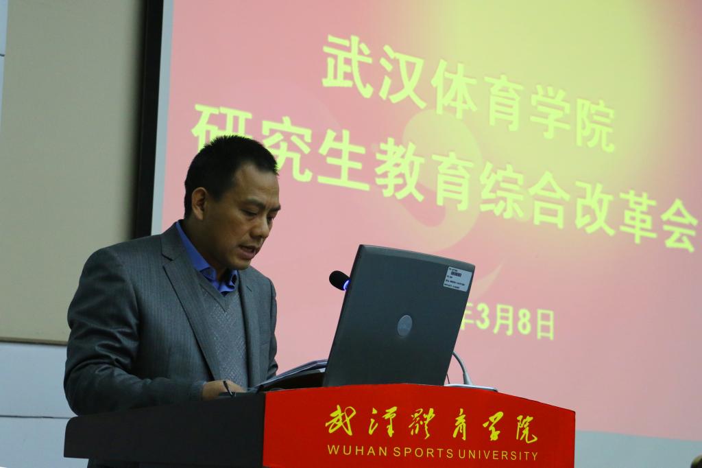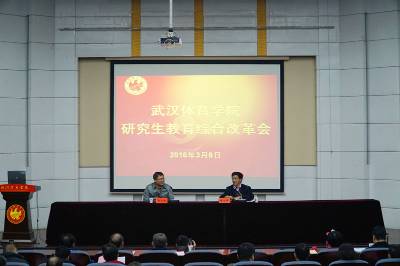 3月8日上午8:30,武汉体育学院2016年研究生教育综合改革会议在东教学楼第三报告厅召开。湖北省学位办主任韩习祥受邀出席会议。我校校领导,各学院党政负责人、主管教学副院长,相关职能部门负责人,硕士导师,博士导师,教研室负责人和教师代表参加会议。会议由校长吕万刚主持。