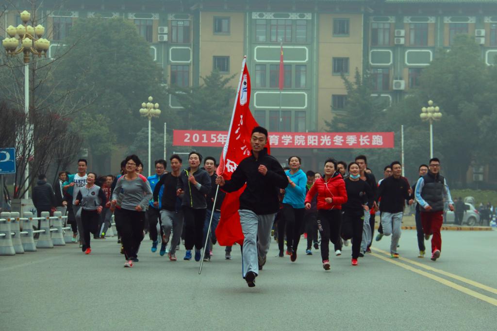 12月23日下午,2015年武汉体育学院阳光体育冬季长跑在行政楼前举行。来自学校各个院系共25支代表队参加了比赛。副校长张飙宣布比赛正式开始,并发令鸣枪。各相关院系及职能部门负责人出席开幕式。