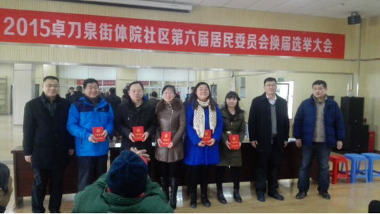 卓刀泉街办事处体院社区,登记参加选举的居民1513人,户代表776名,于2015年12月18日召开选举大会,参加投票的居民户代表761名,共发出选票761张,收回选票702张,其中有效票 691张、弃权票15张、无效票 11张。本次选举应选主任1名、副主任1名、委员3名;经学校组织部提名、居民报名自荐、街道资格审查后,经居民代表会议投票推选,确定主任候选人1名,副主任候选人1名、委员候选人3名。